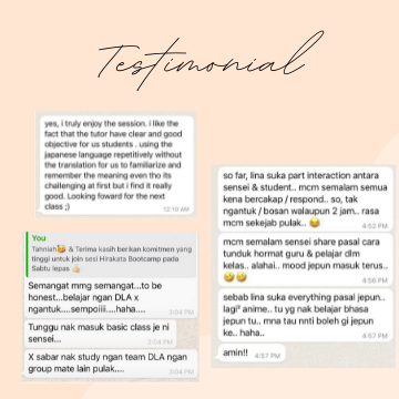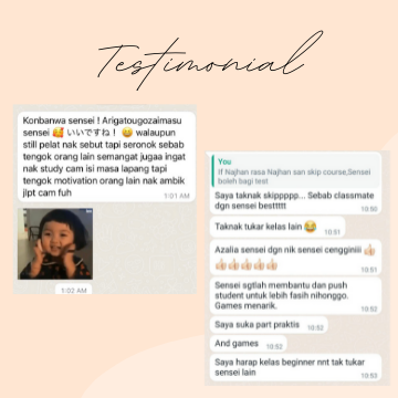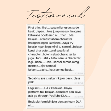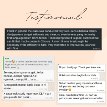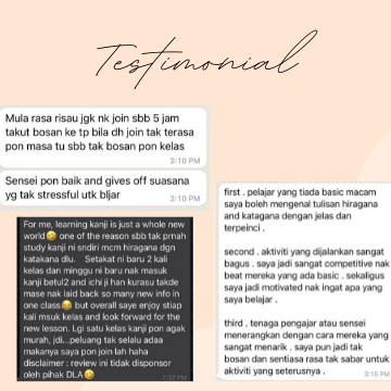 Sensei tachi & circle kawan-kawan yang awesome. Point ni rasanya ramai akan mention tapi saya nak mention juga sebab tanpa Sensei & kawan-kawan yang awesome, tiadalah result yang awesome... tak gitu? Yuran kelas juga mesra poket student š Structured learning, content kelas seiring dgn JLPT level sebenar. They try their best to cover topics supaya student lebih bersedia and bagi tricks utk menjawab soalan-soalan JLPT secara lebih efisien. Dari awal kelas di DLA, penekanan memang diberikan supaya students boleh membaca Hiragana & Katakana. Buku teks yang dipakai juga menggunakan kanji yang sesuai untuk level student jadi kita lebih selesa untuk beradaptasi dengan sistem bacaan bahasa jepun sebenar. DLA telah bantu saya untuk capai target yang saya sendiri tak berani nak challenge. Berbekalkan dorongan Sensei tachi, saya ambil juga JLPT N2 tanpa menaruh sebarang harapan. Berkat doa mereka, Alhamdulillah saya berjaya lulus dan masih tidak putus harapan untuk terus menambahbaik tahap kefahaman Bahasa Jepun saya.